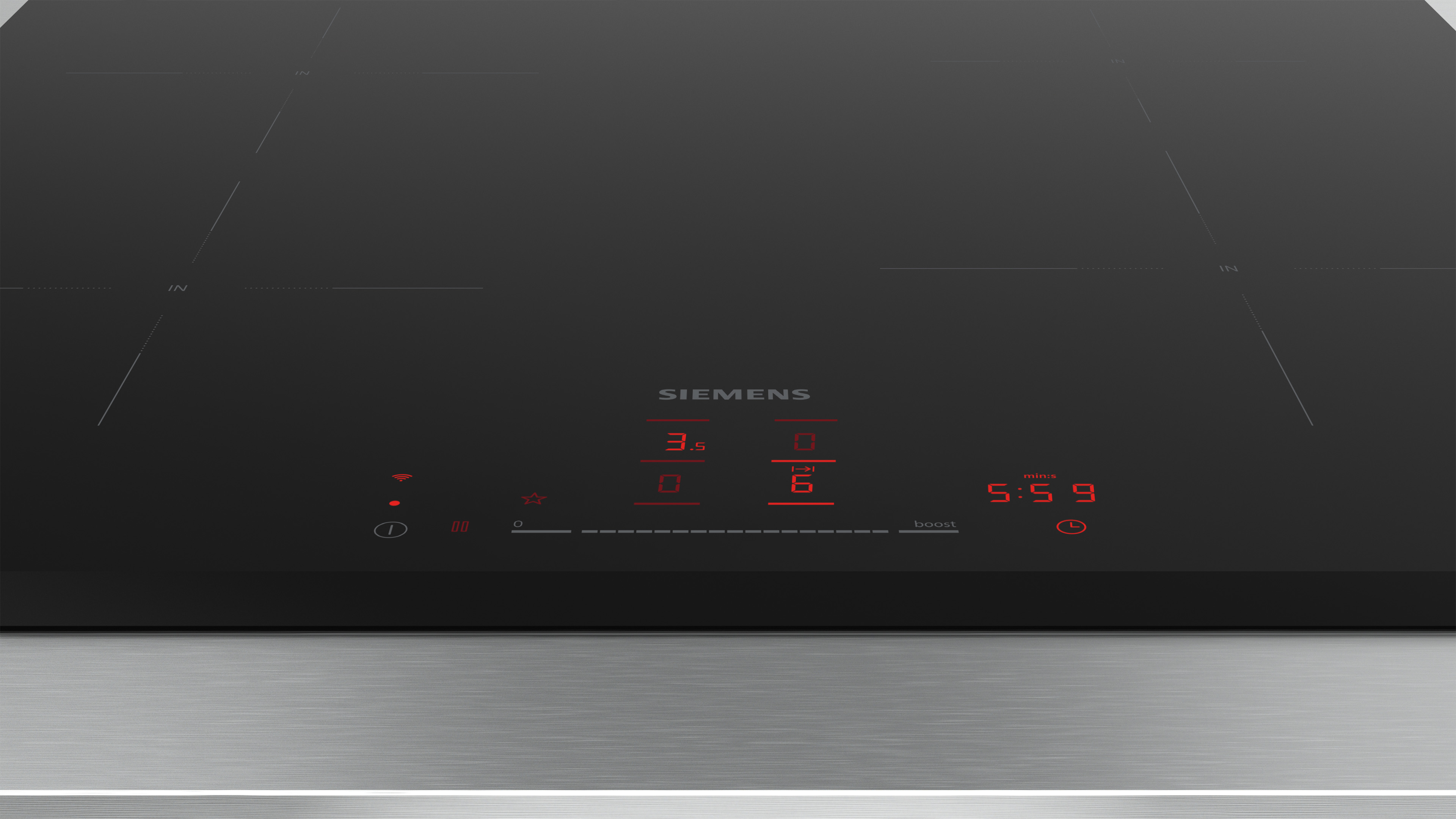 60 cm: espacio para 4 recipientes. Flexibilidad de las zonas de cocción. Zona delante izquierda: 180 mm, 2 kw (potencia max. 3.1 kw) Zona detrás izquierda: 180 mm, 2 kw (potencia max. 3.1 kw) Zona detrás derecha: 145 mm , 1.6 kw (potencia max. 2.2 kw) Zona delante derecha: 210 mm, 2.5 kw (potencia max. 3.7 kw) Prestaciones destacadas Control touchSlider Plus: control directo de la potencia con la barra táctil serigrafiada Mis favoritos: Memoriza el ajuste que más utilices a través de la app Home Connect. 17 niveles de potencia para una mayor precisión Función mantener caliente vía Home Connect (se requiere que la placa esté conectada a Home Connect) Programación de tiempo para cada zona: apaga la zona de cocción al finalizar el tiempo establecido Avisador acústico: una alarma se activa al finalizar el tiempo establecido: una alarma se activa al final del tiempo programado. Volumen del sonido regulable a las preferencias y necesidades personales. Ahorro de tiempo y eficiencia Función boost para todas las zonas: calienta de manera más rápida al incrementar la potencia hasta un 50% comparado con el máximo nivel de potencia: hierve agua hasta un 50% más rapido. shortBoost, seleccionable vía Favorito/Home Connect (para placas conectadas a Home Connect).HC: calienta sartenes más rápido mientras cuida de ellas. Función quickStart: al encender la placa de inducción, ésta seleccionará automáticamente la zona de cocción donde se encuentren los recipientes: al encender la placa, ésta detecta automáticamente el recipiente y selecciona la zona de cocción. Función memoria: en caso de apagado accidental, se restablecerán los ajustes previamente seleccionados al encender la placa de inducción en un lapso de 4 segundos: en caso de apagado accidental, se vuelven a restablecer los ajustes al encender la placa dentro de los 4 segundos siguientes. Conectividad Se conecta a tu móvil vía Home Connect Control placa-campana: controla la campana extractora compatible a través de tu placa cookConnect: la campana ajusta automáticamente el nivel de extracción basado en información como número de zonas de cocción y temperatura (actualmente compatible con campanas inclinadas conectadas a Home Connect). via MyButton: abra el universo inteligente desde su placa de cocción (necesario servicio asociado). Aparato actualizable (vía app Home Connect): mantén el aparato siempre actualizado con la última versión del software. Diseño Terminación con bisel delantero Seguridad Indicador de calor residual en 2 niveles: señaliza qué zonas están calientes o templadas Seguridad para niños: previene la activación no intencionada función «pausa»: detiene el proceso de calentamiento para, por ejemplo, cuando llaman al timbre o se derraman líquidos en la placa. Interruptor principal: apaga todas las zonas con solo un toque Autodesconexión de seguridad de la placa Medidas e instalación Dimensiones del aparato (alto x ancho x profundo mm): 51 x 592 x 522 Dimensiones de encastre (ancho x fondo x alto mm.): 560 x 490 x 51 Encimera de espesor mínimo: 16 mm Potencia nominal: 7.4 kw Potencia total de la placa limitable.