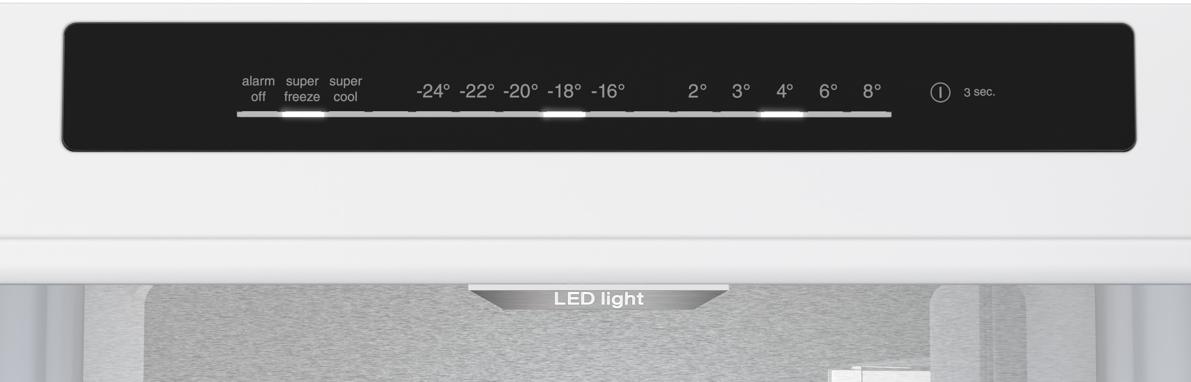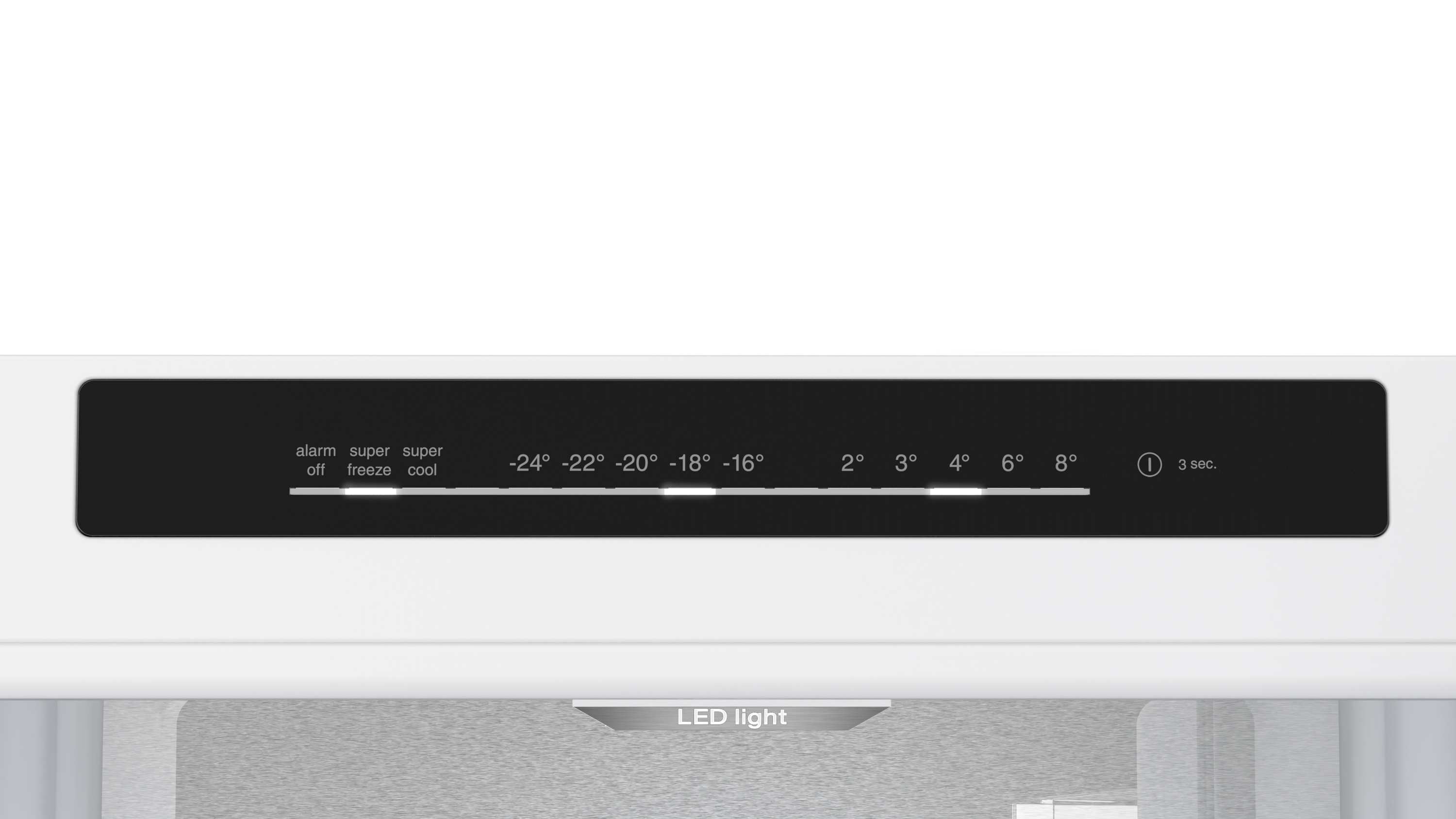 | Control e indicadores | Alarma de avería, Alarma de temperatura, Alarma puerta abierta, Indicador temperatura congelador, Indicador temperatura refrigerador, Interruptor supercongelación, Interruptor superrefrigeración |