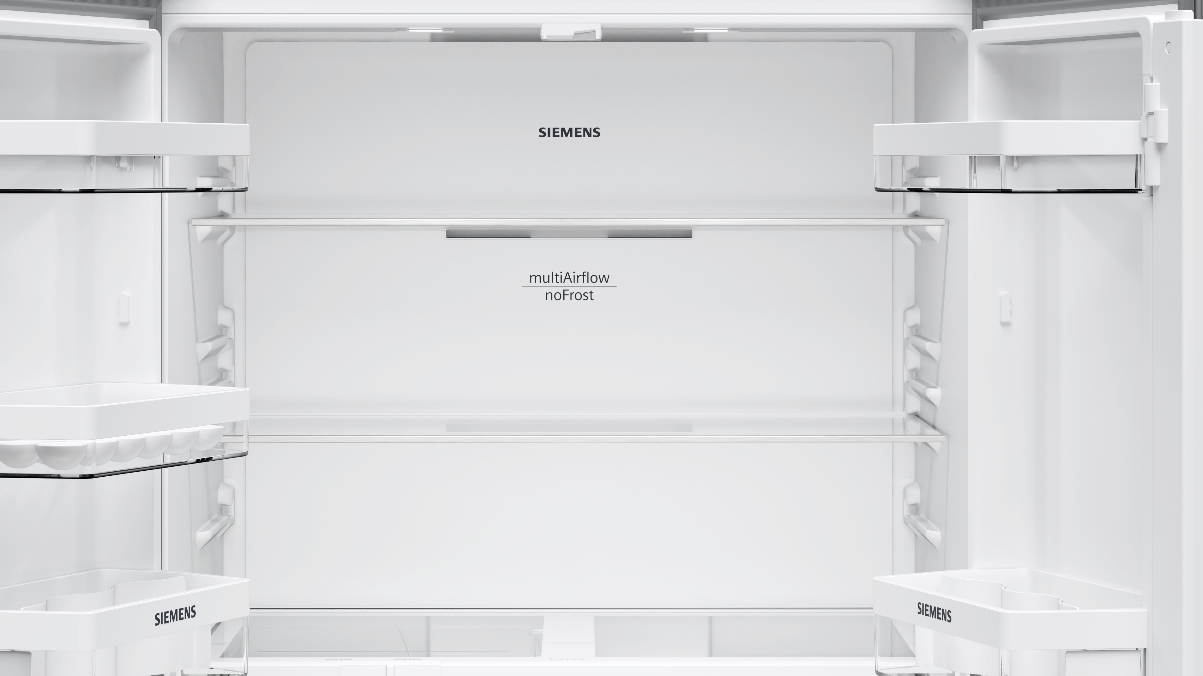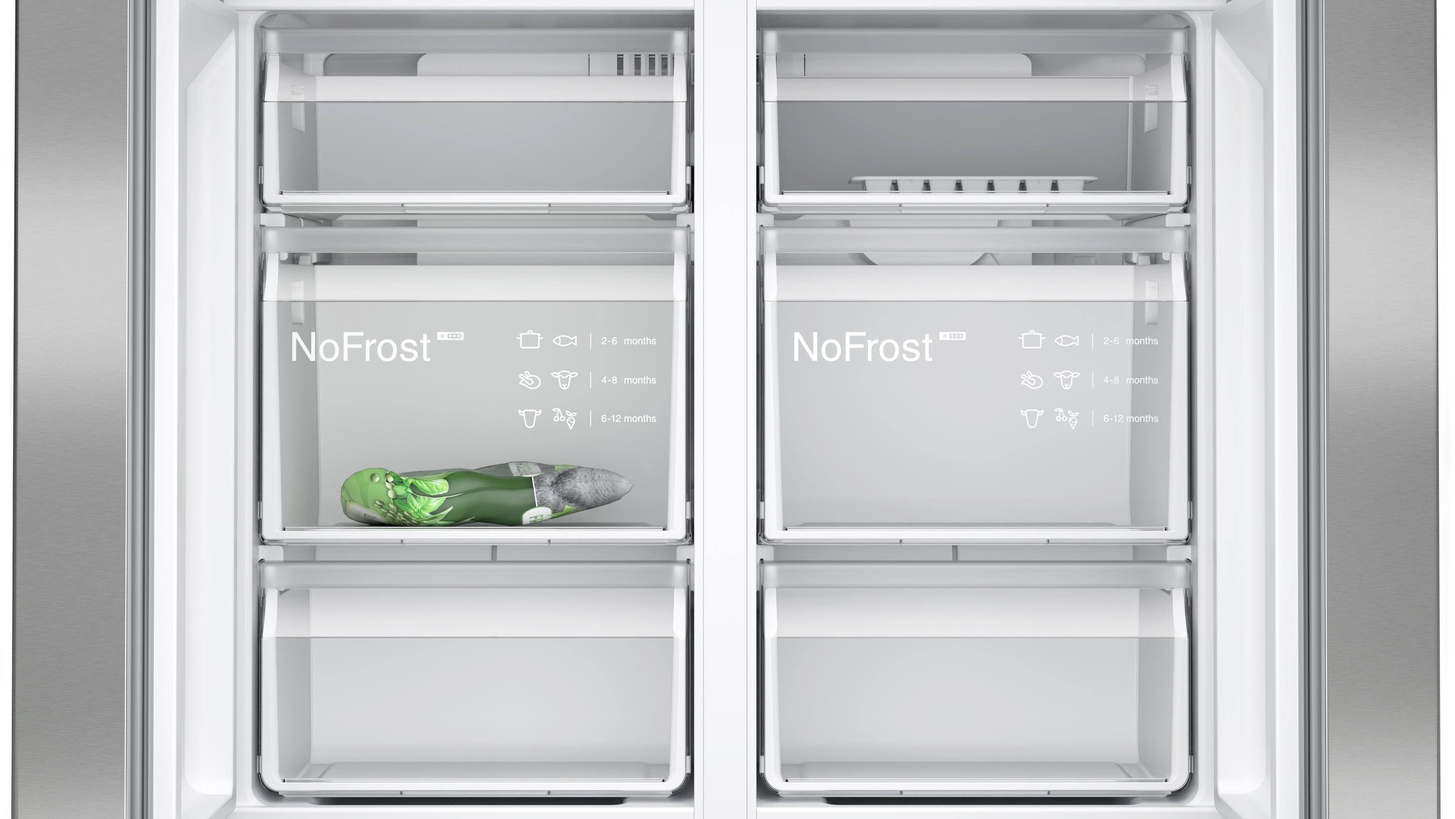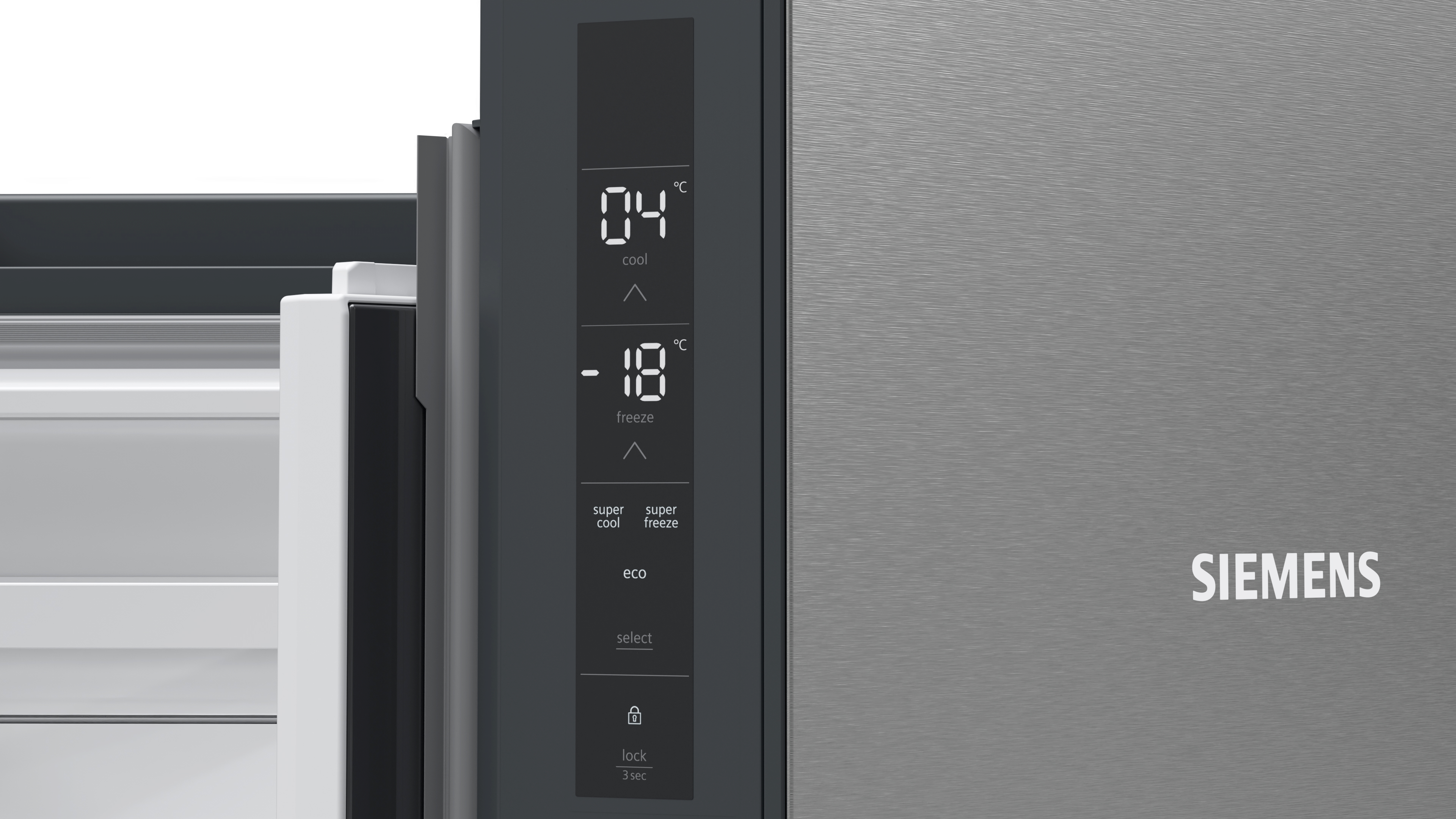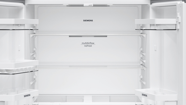 Diseño Display touchControl digital integrado en la puerta Iluminación interior LED Panel trasero interior con diseño blanco brillante Equipamiento interior con perfiles cromados Prestaciones Tecnología noFrost Función ´super-refrigeración´ con desconexión automática Desescarche automático del refrigerador Funciones especiales: Eco Volumen útil total: 605 l Capacidad útil total del refrigerador: 405 l Capacidad útil total del congelador: 200 l Equipamiento y seguridad 3 bandejas de cristal de seguridad en el refrigerador, 2 de ellas con perfiles cromados y regulables en altura Bandejas de cristal EasyAccess con tope de seguridad en el refrigerador 2 balcones grandes , 3 balcones pequeños Botellero flexible Alarma óptica de puerta abierta., Alarma acústica de puerta abierta Alarma de temperatura Sistema de conservación Cajón hyperFresh ?0°C? para carnes y pescados 1 cajón hyperFresh con control de humedad y raíles - Conserva frutas y verduras frescas durante más tiempo Congelador 6 cajones transparentes en el congelador Una cubitera Información técnica 4 ruedas para un fácil transporte, 3 de ellas regulables en altura. Medidas Dimensiones del aparato (alto x ancho x fondo sin tirador): 183 x 91 x 73.1 cm Etiquetado energético y otra información técnica Clase de eficiencia energética: E, dentro del rango de A (más eficiente) a G (menos eficiente) Consumo anual de energía: 333 kWh/a Muy silencioso: 38 dB